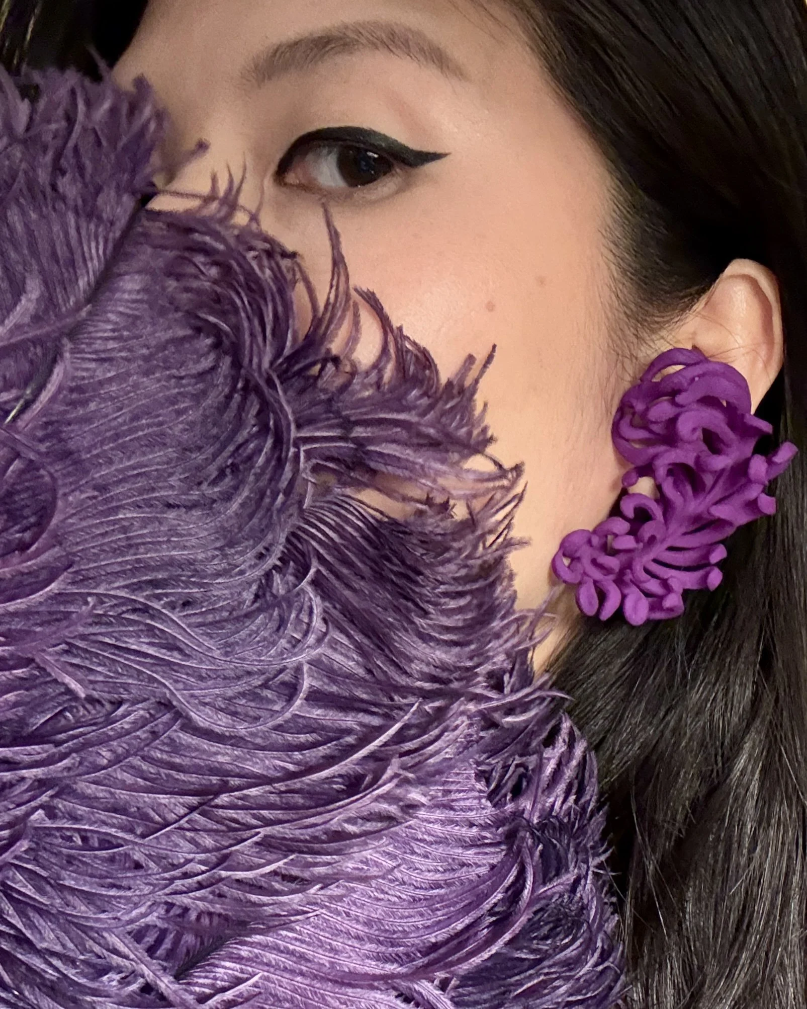 A pair of purple resin “Tickle Me” earrings in the shape of feathers, with 18k yellow gold clips